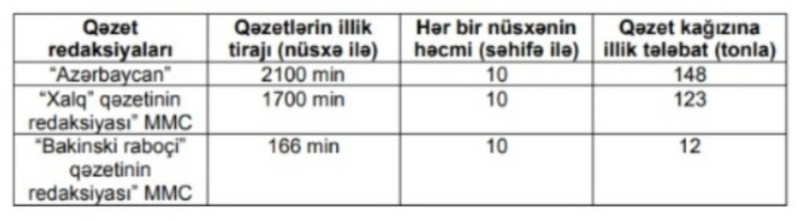 "Azərbaycan", "Xalq qəzeti", "Respublika" və "Bakinski raboçi" qəzeti redaksiyalarına dövlət büdcəsinin vəsaiti hesabına alınacaq qəzet kağızının norması müəyyənləşib.