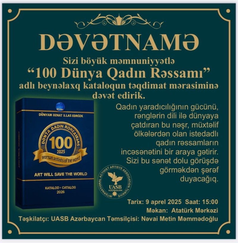 9 aprel 2025-ci il tarixində, saat 15:00-da Atatürk Mərkəzində “Dünyanı Sənət Xilas Edəcək” layihəsi çərçivəsində nəşr olunan “Dünyanın yüz qadın rəssamı” adlı beynəlxalq kataloqun təqdimat mərasimi baş tutacaq.
