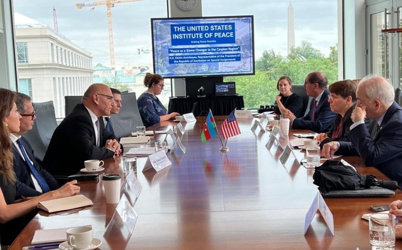 Səfirliyin digər paylaşımında azərbaycanlı diplomatın “ABŞ Sülh İnstitutunun təşkil etdiyi dəyirmi masada tanınmış beyin mərkəzlərinin nümayəndələri ilə görüşdüyü” diqqətə çatdırılıb: “Tədbir zamanı Azərbaycan – ABŞ münasibətləri, davam edən Azərbaycan – Ermənistan sülh prosesinin hazırkı vəziyyəti və perspektivləri, regional və beynəlxalq təhlükəsizlik məsələləri müzakirə edilib”.