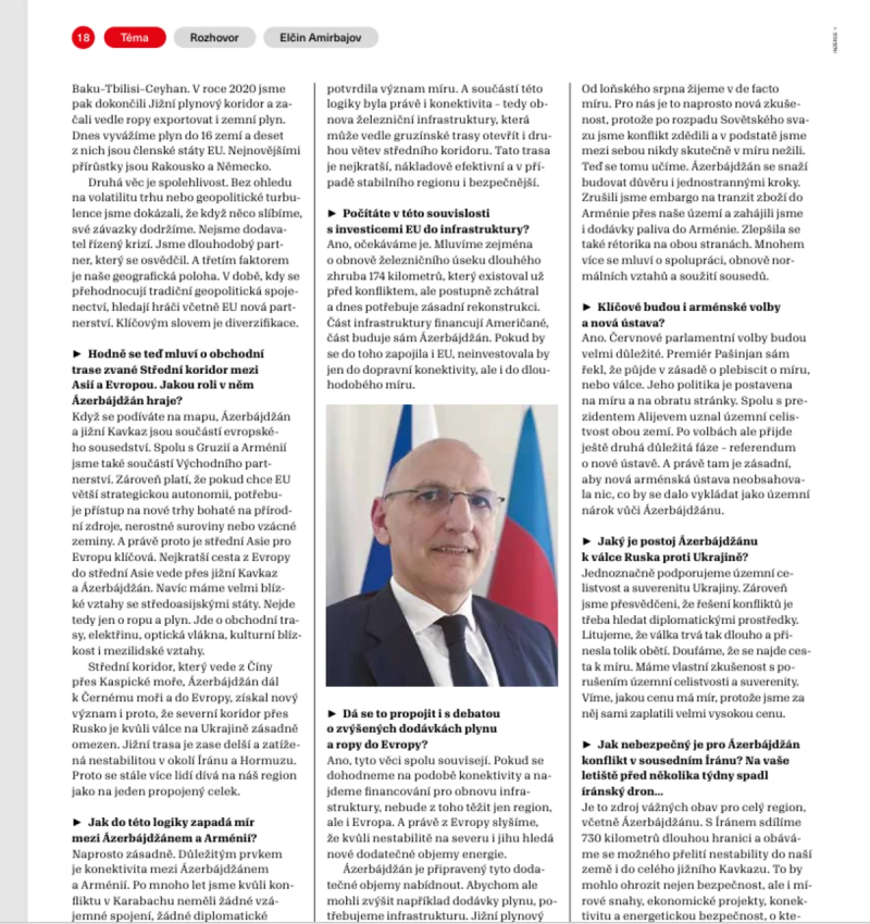 Müsahibə zamanı Azərbaycan–Çexiya strateji tərəfdaşlığı, Orta Dəhlizin artan əhəmiyyəti və bu xüsusda Azərbaycanın Avropa ilə Asiya arasında vacib nəqliyyat qovşağına çevrilməsi, Azərbaycan-Ermənistan normallaşma prosesi, habelə regional təhlükəsizlik məsələləri ətrafında fikir mübadiləsi aparılıb.