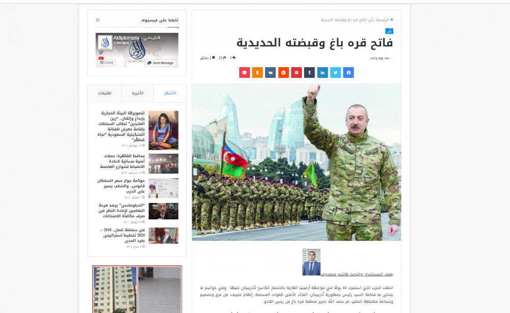 Adalet.az xəbər verir ki, bu fikirlər Misirin “Aldiplomasy, “Əl Dövlə”, Əlcəzairin “Əl Hərir”, həmçinin İraq, İordaniya, Küveyt KİV-lərində dərc olunmuş şərqşünas Həşim Məmmədovun “Qarabağ fatehi və onun dəmir yumruğu” sərlövhəli məqaləsində yer alıb.