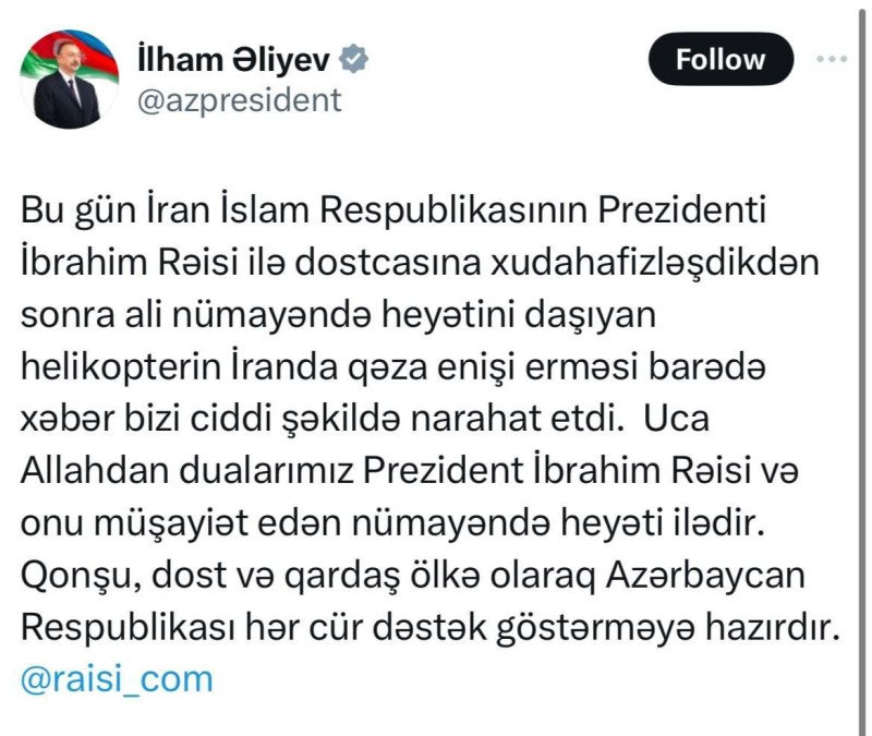 "Bu gün İran İslam Respublikasının Prezidenti İbrahim Rəisi ilə dostcasına xudahafizləşdikdən sonra ali nümayəndə heyətini daşıyan helikopterin İranda qəza enişi erməsi barədə xəbər bizi ciddi şəkildə narahat etdi. Uca Allahdan dualarımız Prezident İbrahim Rəisi və onu müşayiət edən nümayəndə heyəti ilədir. Qonşu, dost və qardaş ölkə olaraq Azərbaycan Respublikası hər cür dəstək göstərməyə hazırdır".