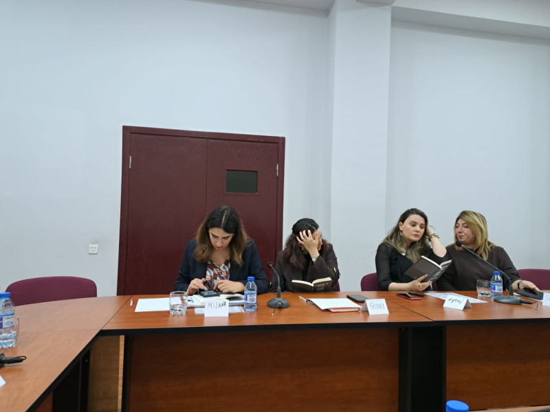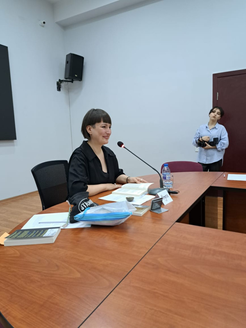 Regina Bakıda nəşr edilən romanının ilk tərcüməolduğunu deyib, əsərin hansı zərurətdən yaranmasından danışıb. Qısa müddətdə çox səmimi ortam yaradan qonaq tələbələrdən romandan parçalar oxunmasını xahiş edib, əsərin dilimizdə necə səsləndiyini dinləmək istəyib, onları maraqlandıran suallara cavab verib. Onun təklifi ilə görüş iştirakçılarıtərəfindən daş, yaddaş, “kitab olsam hansı məzmunda olmaq istəyərdim?” mövzularında mətnlər yazılıb, oxunulub.