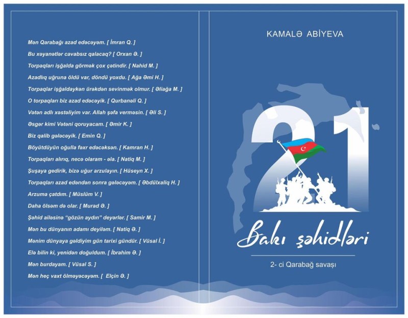 «Bakı şəhidləri» (İkinci Qarabağ savaşı) kitabında Bakıda doğulub, Bakıdan torpaqlarımızın azad edilməsi uğrunda gedən döyüşlərə qatılan 21 şəhid haqqında məqalə, ellegiyadı. Kitab dəyərli yazıçı-publisist, şairə Aysel Əlizadənin redaktorluğu ilə işıq üzü görüb. Burda xüsusi vurğulamaq yerinə düşər ki, kitabda barəsində Kəmalə xanımın kövrək duyğuları yer alan qəhrəmanlarının hamısının rəngli şəkilləri oxuculara təqdim olunub. Həmin şəkillərdən bu günümüzə boylanan və mənalı baxışları ilə bizə ürəyini açan qəhrəmanların hamısı bir-birindən cavan, bir-birindən yaraşıqlı və bir-birindən də məğrur igidlərdi. Onları birləşdirən isə Vətən, bir də Üçrəngli bayrağımızdı. Məhz o üçrəngli bayrağın Vətənin bütün guşələrində dalğalanması üçün həmin igidlər döyüşə atılıblar.