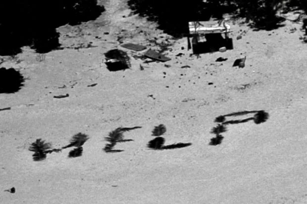 Nəhayət dənizçilər 31 hektarlıq adadan xurma yarpaqlarını toplayıblar və ağ qumlu sahildə “HELP” (Kömək edin) sözünü yazıblar.