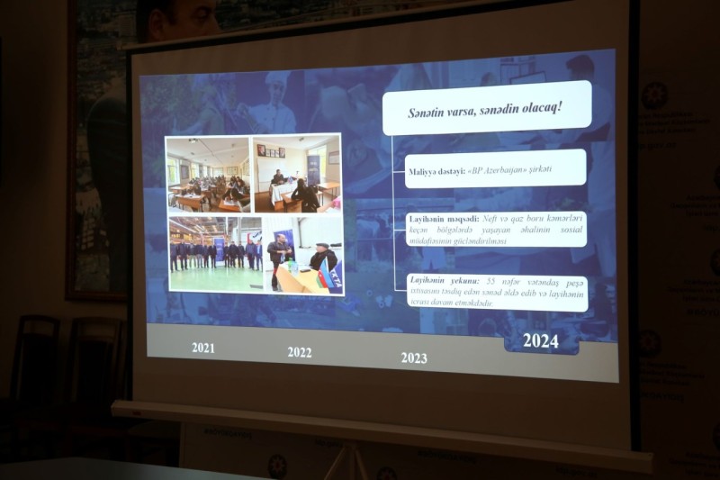 Daha sonra TKTA-nın Qeyri-formal və İnformal Təhsilin Tanınması Şöbəsinin müdiri Mansur Rəhimli təqdimatla çıxış edib. O, ölkəmizdə peşə təhsilinin cari vəziyyəti, formal təhsil ala bilməyən, lakin müxtəlif vasitələrlə peşə bacarıqları əldə edən şəxslərin peşəkar fəaliyyətinə dəstək olan “Sənətin varsa, sənədin olacaq” layihəsinə keçmiş məcburi köçkünlərin cəlb edilməsinin əhəmiyyəti haqqında danışıb. TKTA tərəfindən verilən sertifikat və diplomların onların məşğulluq imkanlarının genişləndirilməsinə təsiri vurğulanıb.