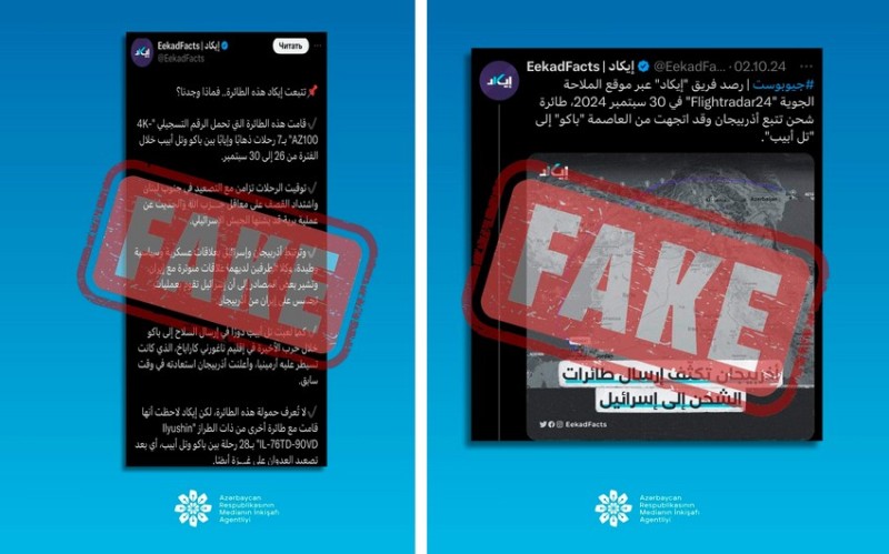 "EekadFacts” adlı internet resursuna aid sosial şəbəkə hesablarında guya Azərbaycandan hava yolu ilə digər ölkəyə silah daşınması barədə həqiqətə uyğun olmayan saxta məlumat yayılmışdır.