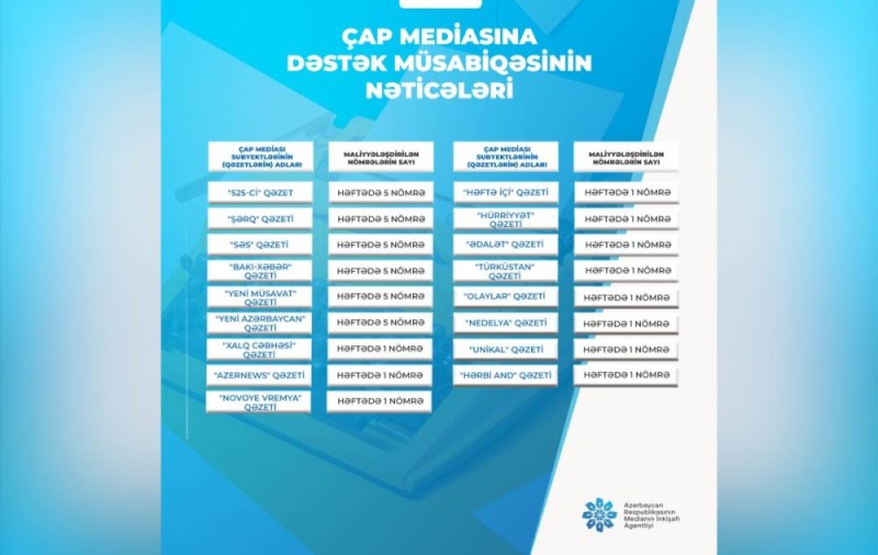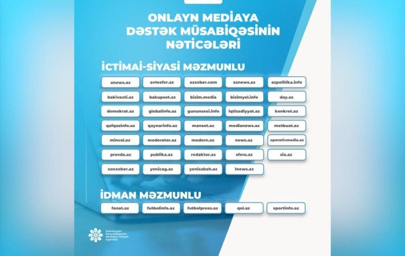 Onlayn və çap mediası subyektlərinə dəstək layihəsi çərçivəsində elan edilmiş müsabiqənin nəticələri açıqlanıb.