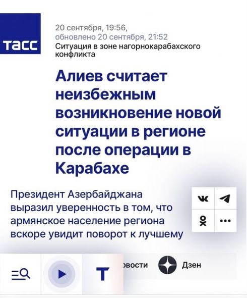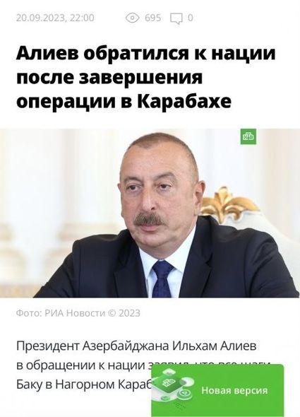 “NTV” telekanalı Azərbaycan Prezidentinin Qarabağda aparılan əməliyyatın tamamilə legitim, qanuni və ədalətli olması barədə fikirlərini sitat gətirir. Materialda qeyd olunub ki, qanunsuz silahlı birləşmələr tam tərksilah olunacaq, onlardan müsadirə olunan texnika məhv ediləcək.