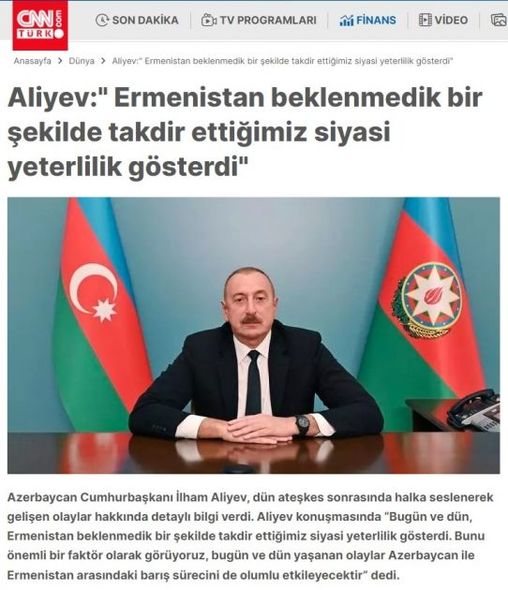 Türkiyə KİV-ləri Prezident İlham Əliyevin müraciətində Qarabağın erməni sakinlərinə mesajlarına da xüsusi yer veriblər. Dövlətimizin başçısının Azərbaycan dövləti və xalqının bütün haqsızlıqlara, kriminal Ermənistan rejimi tərəfindən törədilmiş bütün cinayətlərə baxmayaraq, erməni xalqını bu cinayətlərdə heç vaxt günahlandırmadığını qeyd etməsi bildirilib.