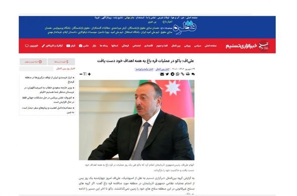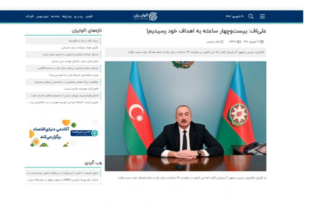 Materiallarda Azərbaycan Prezidenti İlham Əliyevin xalqa müraciətindən sitat gətirilib. Qeyd olunub ki, Azərbaycan öz məqsədinə nail olaraq suverenliyini bərpa etdi. Prezident İlham Əliyev orduya antiterror tədbirləri zamanı mülki əhalinin təhlükəsizliyinin təmin olunması haqqında əmr verib. Xəbərlərdə nəzərə çatdırılıb ki, Prezident Qarabağın erməni əhalisinin təhlükəsizliyinə və hüquqlarının qorunmasına zəmanət verib.