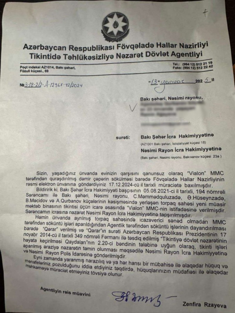 A.Məmmədova qeyd edib ki, “Vialon” şirkətinə ərazidə söküntünün qadağan olunması barədə Fövqəladə Hallar Nazirliyinin qərarı var:
