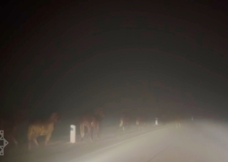 Adalet.az AzərTAC-a istinadən xəbər verir ki, qızılı rəng çalarları olan 30-dan çox vəhşi atın yürüşü ötən gün saat 21 radələrində Şuşa-Laçın avtomobil yolunun “Yeddi dolama” adlanan hissəsində qeydə alınıb. Görüntülər havanın dumanlı olması səbəbindən atlar meşəlikdən çıxaraq yolla irəliləyən zaman çəkilib.