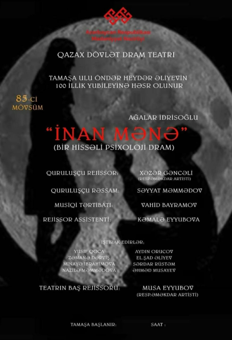25 sentyabr 2023-cü il tarixdə saat 18.00-da Azərbaycan Teatr Xadimləri İttifaqının "QONAQ TEATR" layihəsi çərçivəsində Qazax Dövlət Dram Teatrının "İnan mənə" (Ağalar İdrisoğlu) tamaşası oynanılacaq. Tamaşaya giriş sərbəstdir. Ünvan: Bakı şəhəri, Xaqani küçəsi, 16, I mərtəbə.