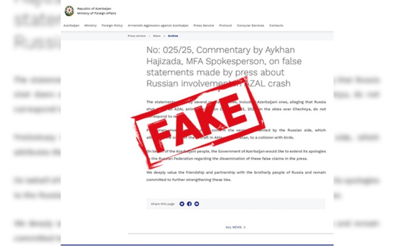 Sosial şəbəkələrdə Azərbaycan Xarici İşlər Nazirliyi adından “Azərbaycan Hava Yollarına” məxsus sərnişin təyyarəsinin Aktauda qəzaya uğraması ilə bağlı feyk məlumatlar yayılıb.