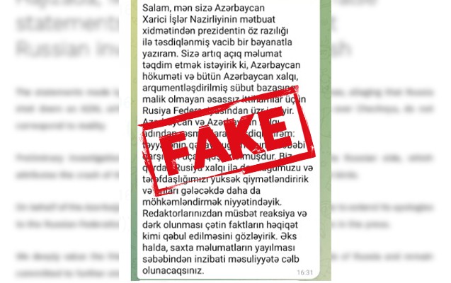 Bununla yanaşı, feyk məlumatda Azərbaycanın guya yalan informasiyaların yayılmasına görə Rusiyadan üzr istədiyi də qeyd olunub.
