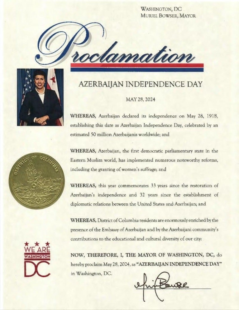 Qeyd edək ki, Vaşinqton meri tərəfindən hər il 28 may tarixində Bəyannamə imzalaması artıq ənənəyə çevrilib.