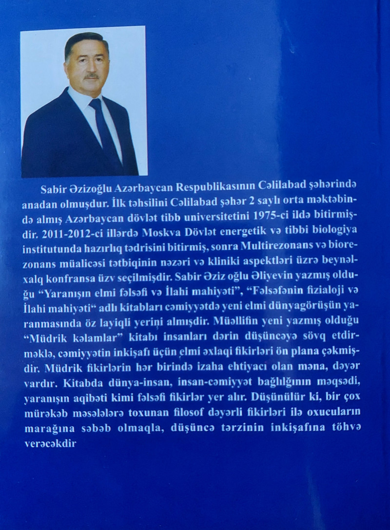 Bəli, həkimlə Azərbaycan Nəşriyyatının foyesində qarşılaşdıq. Söhbətimiz yenə ötən günlərdə olduğu kimi özümüzdən başlayıb, bədii yaradıcılığa, mətbuata qədər uzandı. Bu söhbət əsnasında məlum oldu ki, Sabir həkimlə görüşmədiyimiz müddətdə maraqlı yaardıcılıq uğurları olub. İki kitabı işıq üzü görüb. Onlardan biri fəlsəfə ilə bağlıdır. İkincisi isə “Müdrik kəlamlar” adlanır. Doğrudur, bu gün özünü və sözünü müdrik hesab edənlər kifayət qədərdir. Amma söhbət mənim  özümü necə qiymətləndirməyimdən, təqdim etməyimdən getmir. Axı son fikir oxucuya aiddir. O qoyur nöqtəni. Yəni yaradıcılığa dəyər verən, münasibət bildirən oxucudur. Bunu yaxşı bildiyimdən mən də həmişə oxumadığım bir şey haqqında öncədən  heç nə deyə bilmirəm. Daha doğrusu, demirəm. Lakin Sabir həkimin  qələminə bələd olduğumdan  içimdə onun kəlamlarının müdrik olacağına şübhə yox idi. Kitabı oxuyanda da yanılmadığıma bir daha əmin oldum.