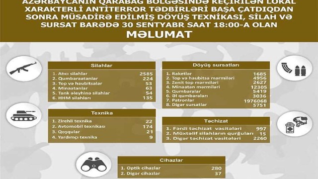 Müdafiə Nazirliyi Azərbaycanın Qarabağ bölgəsində keçirilən lokal xarakterli antiterror tədbirləri başa çatdıqdan sonra müsadirə edilmiş döyüş texnikası, silah və sursat barədə sentyabrın 30-u saat 18:00-a olan məlumatı açıqlayıb.