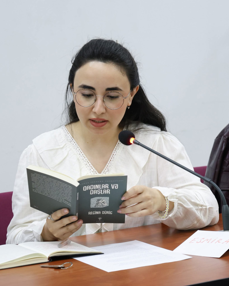 Regina Bakıda nəşr edilən romanının ilk tərcüməolduğunu deyib, əsərin hansı zərurətdən yaranmasından danışıb. Qısa müddətdə çox səmimi ortam yaradan qonaq tələbələrdən romandan parçalar oxunmasını xahiş edib, əsərin dilimizdə necə səsləndiyini dinləmək istəyib, onları maraqlandıran suallara cavab verib. Onun təklifi ilə görüş iştirakçılarıtərəfindən daş, yaddaş, “kitab olsam hansı məzmunda olmaq istəyərdim?” mövzularında mətnlər yazılıb, oxunulub.
